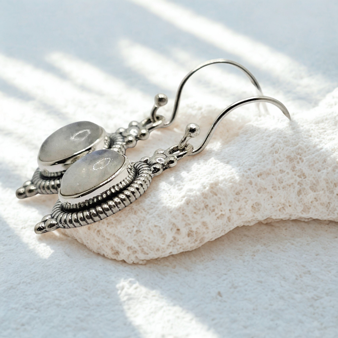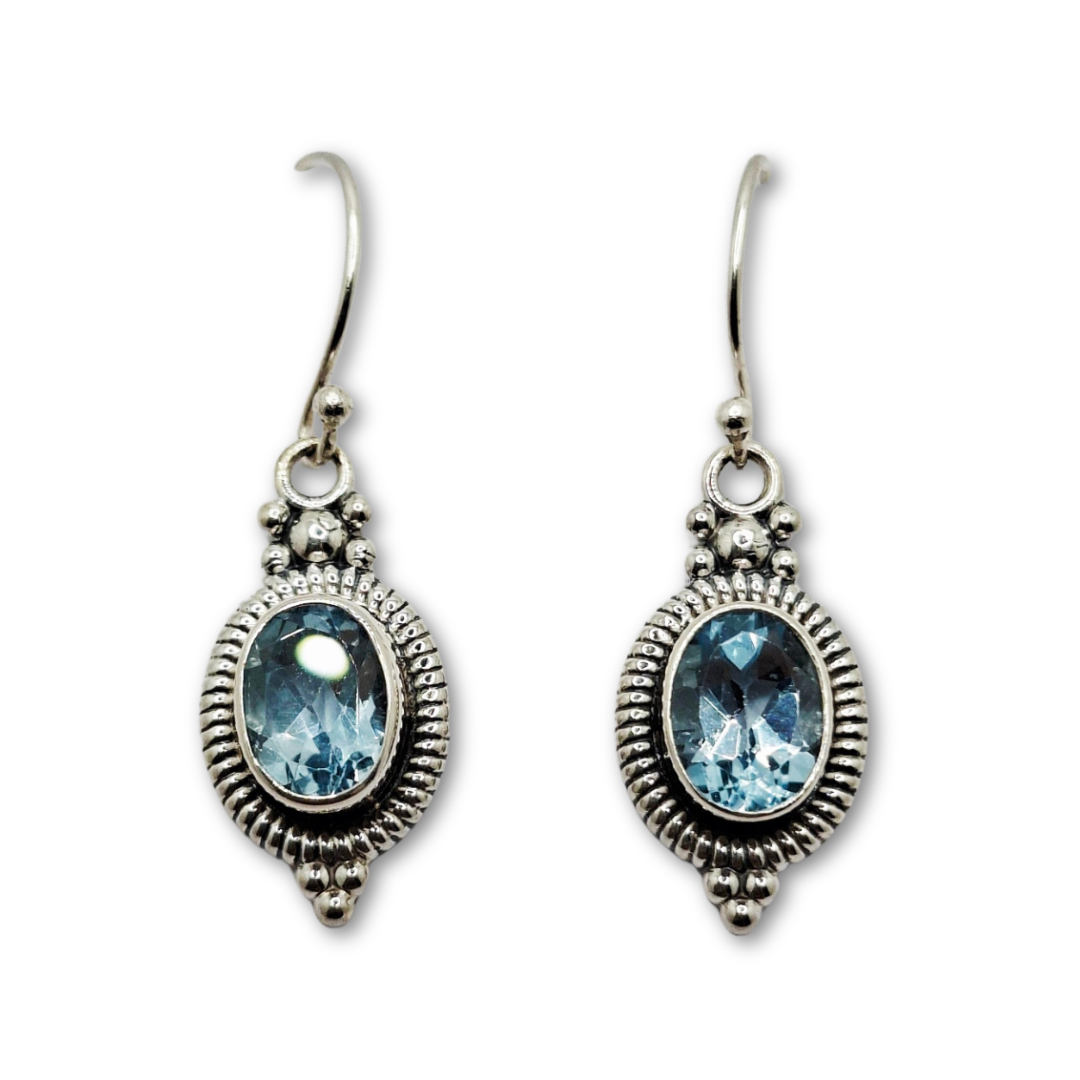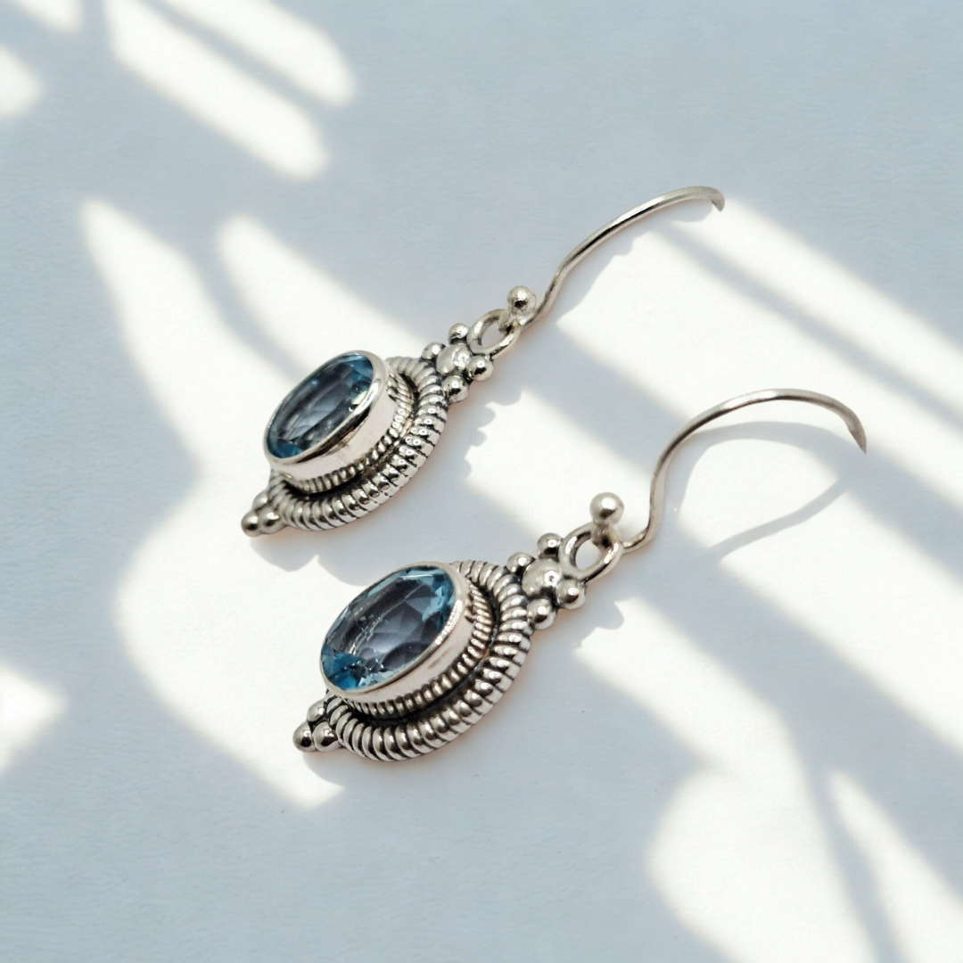 The luminous gemstones, renowned for its clarity and calming hue, offers a touch of refined elegance that complements any complexion. These Bali earrings embody a perfect fusion of traditional charm and contemporary appeal, making them an essential addition to any discerning jewelry collection. The graceful dangle design ensures the earrings move with you, catching and reflecting light to highlight the dazzling stone.