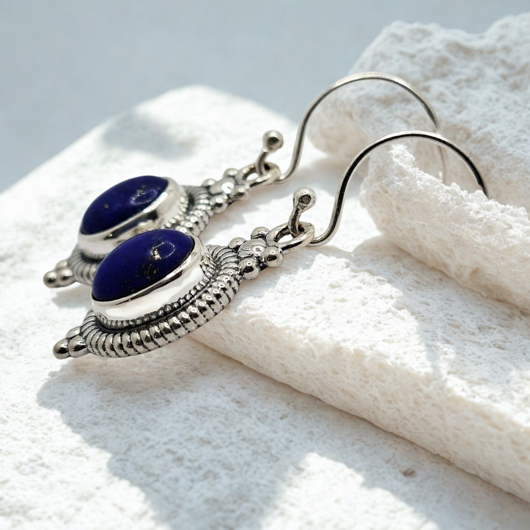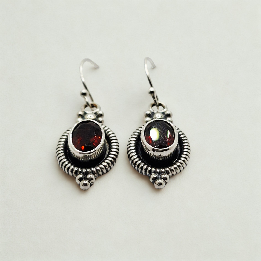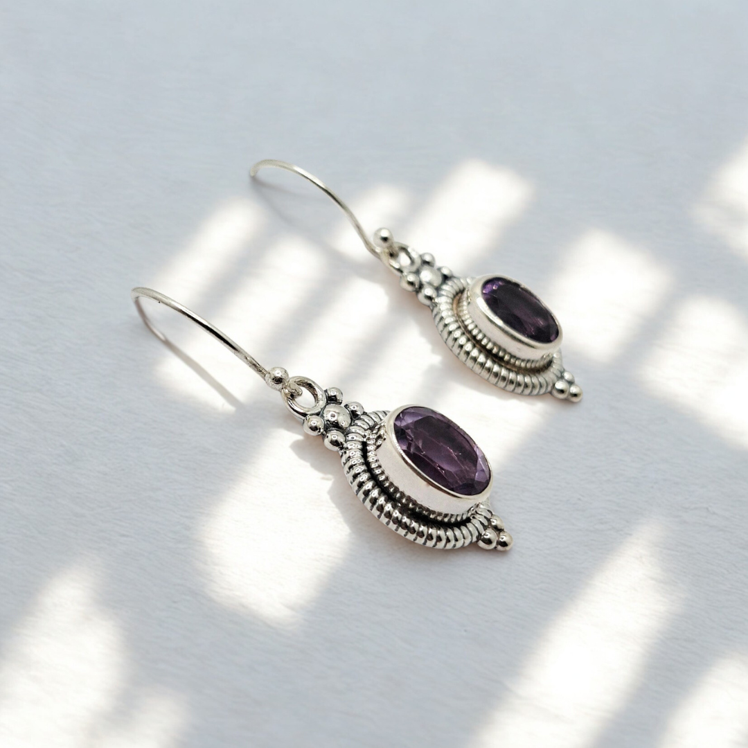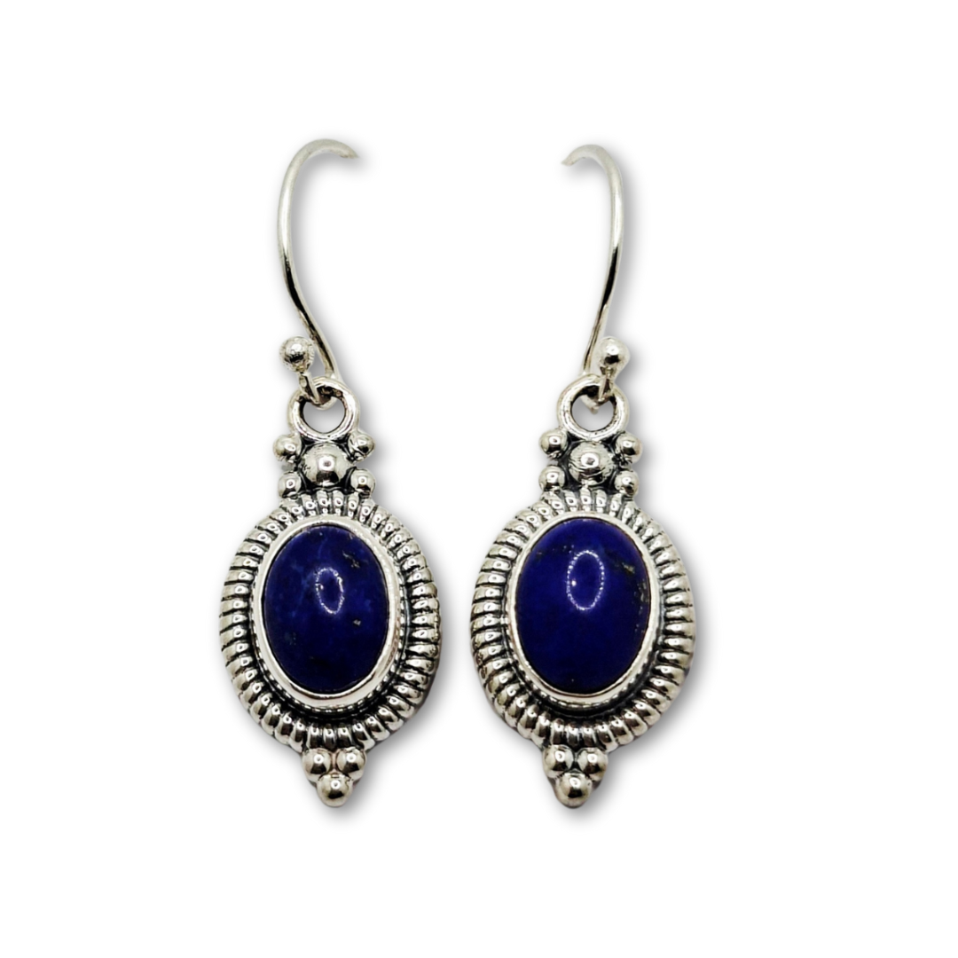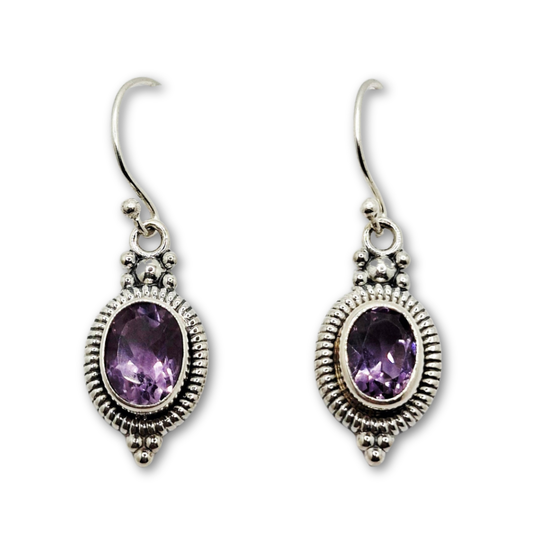 Adorn yourself with the serene brilliance of these exquisite Bali sterling silver dangle earrings, showcasing captivating oval gemstones including garnet, blue topaz, amethyst, and lapis lazuli stones. Each pair is a testament to the time-honored artistry of Balinese jewelry making, meticulously handcrafted by skilled artisans. Made from premium S925 sterling silver, these earrings feature an intricate setting with classic beaded and rope-like detailing that beautifully frames the radiant gemstones, enhancing its natural sparkle.